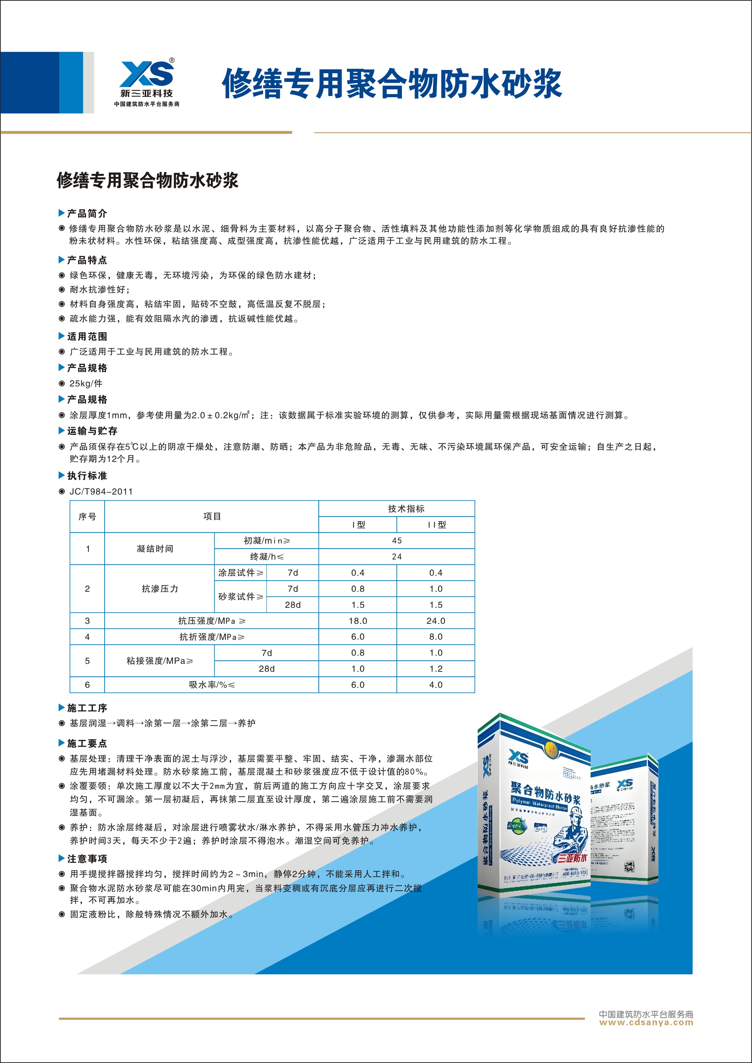 產(chǎn)品簡(jiǎn)介: 聚合物水泥防水砂漿是是以水泥、細(xì)骨料為主要材料,以高分子聚合物、活性填料及其他功能性添加劑等化學(xué)物質(zhì)組成的具有良好抗?jié)B性能的粉未狀材料。水性環(huán)保,粘接強(qiáng)度高、成型強(qiáng)度高,抗?jié)B性能優(yōu)越,廣泛適用于工業(yè)與民用建筑的防水工程。 規(guī)格:25kg/袋 | ![]() | ![]() |