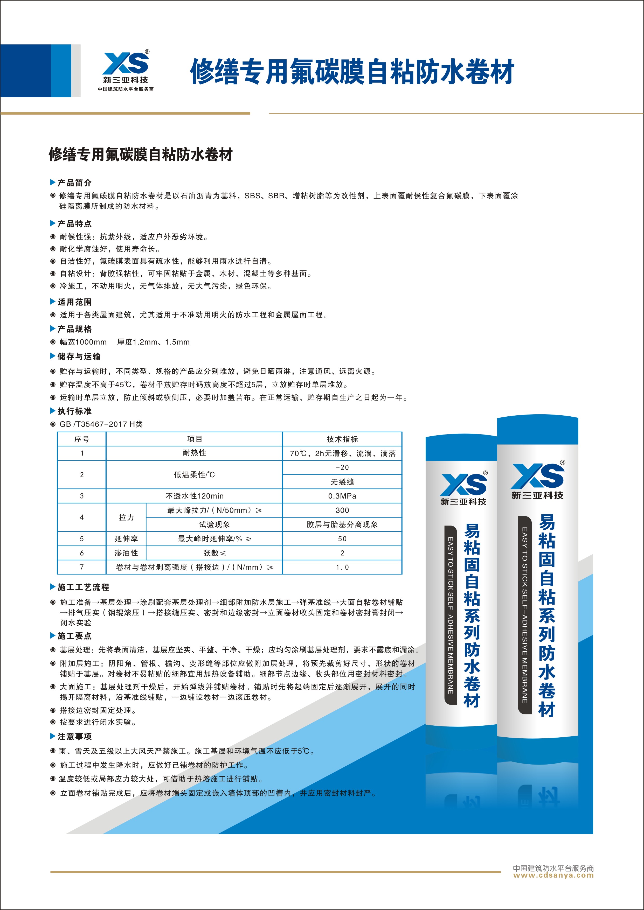 產(chǎn)品簡介: 以石油瀝青為基料,SBS、SBR、增粘樹脂等為改性劑,上表面覆耐侯性復(fù)合氟碳膜,下表面覆涂硅隔離膜所制成的防水材料。 規(guī)格:1.2 mm 厚度*寬度*長度 1.2mm*1.0m*20m 面膜顏色 白色 | ![]() |