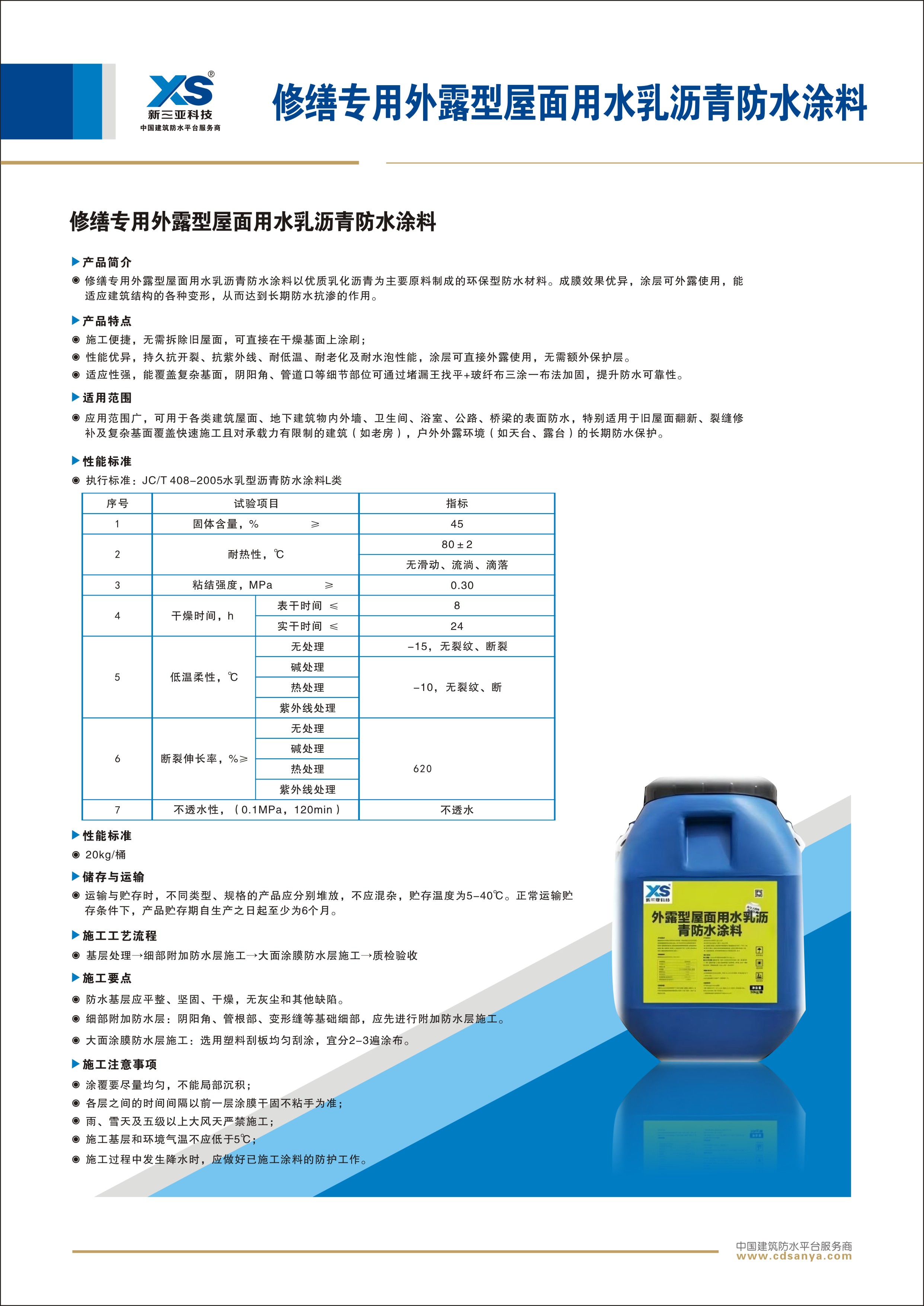 產(chǎn)品簡介: 修繕專用外露屋面用水乳瀝青防水涂料是以優(yōu)質(zhì)乳化瀝青為主要原料制成的環(huán)保型防水材料。成膜效果優(yōu)異,涂層可外露使用,能適應(yīng)建筑結(jié)構(gòu)的各種變形,從而達到長期防水抗?jié)B的作用。 規(guī)格:50kg/桶 | ![]() |